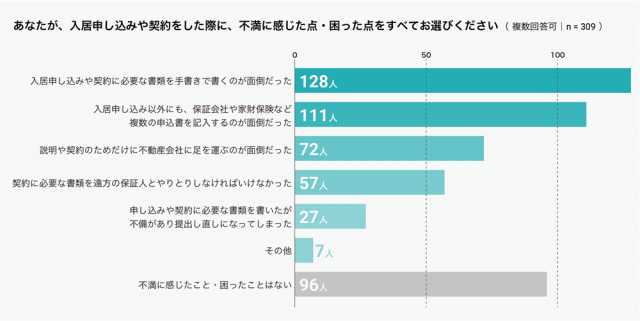 入居申し込みや契約の際の不満や困った点は「入居申し込みや契約に必要な書類を手書きで書くのが面倒」が128人、「入居申し込み以外にも保証会社や家財保険など複数の申込書を記入するのが面倒」が111人など、書類記入への不満が多い。イタンジではスマホを活用し内見予約や契約までオンラインで行える「OHEYAGO(オヘヤゴー)」というサービスを提供。新型コロナウイルスの影響もあり、非対面サービスの需要は拡大するとみているという。