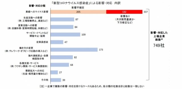 工場等で生産調整や稼働停止といった、生産活動に影響が出た企業は87社。小売業やサービス業など「内需型企業」のうち、店舗や拠点の営業休止、営業時間短縮対応など営業活動に影響が出た企業は84社。サービス提供・イベントなどの開催中止・延期は109社に上った。自社や関連会社などで従業員感染が判明した企業は47社だった。