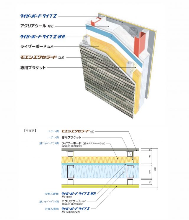 [図]のように建物内側から、石こうボード(タイガーボード・タイプZ、厚12.5×2)、HGW(アクリアウール16k、厚100)、石こうボード(タイガーボード・タイプZ-WR、厚15)、専用ブラケット、撥水グラスウール(ライザーボード32k、厚50)、窯業系外装材(モエンエクセラード)の構成とした。
