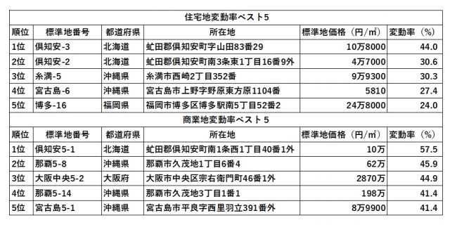 住宅地と商業地の変動率ベスト5は下記の通り。北海道倶知安町は人気のリゾート地。国交省によると店舗需要の他、北海道新幹線の工事のための作業員向けの住宅需要もあるという。沖縄県は2015年の伊良部大橋開通で観光客が急増した宮古島や、那覇市と周辺エリアの地価上昇が激しい。