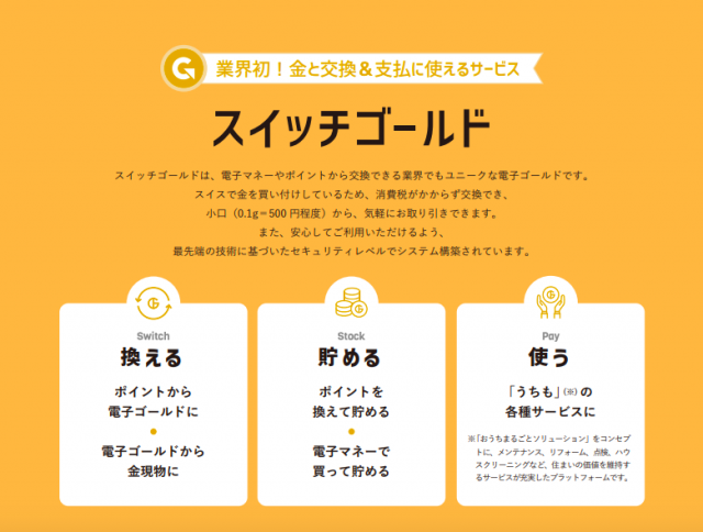 「スイッチゴールド」は、金(ゴールド)の保有量に応じて発行され、電子マネーやポイントから交換できる電子ゴールド。電子ゴールドから金現物に換えられるほか、ギフトコードの贈り物や株主優待制度としての活用も可能。同社が住宅オーナー向けに提供するサービスプラットフォーム「うちも」内の各種サービスでも利用できる。
