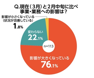 それによると、2月中旬に比べ、現在(3月上旬)の方が「事業・業務への影響が大きくなっている」との回答が76.1%を占めた上に、最も大きな影響が出ている設備・建材の納期遅延については84.1%が「解消のめどが立っていない」と回答、経営への影響についての質問に対しては66.4%が「売り上げ・受注棟数の減少が見込まれる」と回答しており、状況がより深刻化していることが浮き彫りとなった。