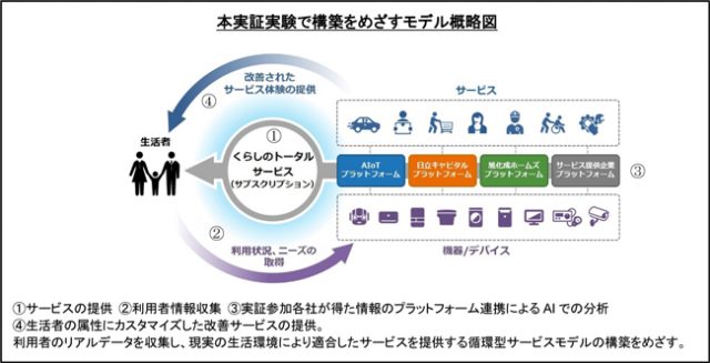 同実験によって、単身者、DEWKs(共働きで子育てをしている夫婦)、シニアなど進行するライフステージとともに変化する住まいや生活に合わせた、新たな循環型サービスモデルの構築を図る。各社が連携して取得した生活者のデータをAI技術によって分析することで、世代別に最適化した暮らしのトータルサービスを創出し、サブスクリプションで提供する。