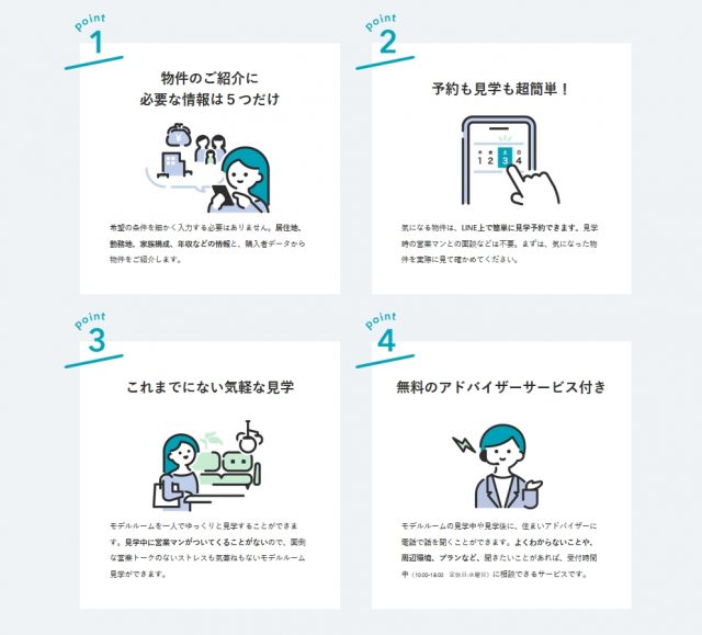 「マンションFit」のLINE公式アカウントを友達に追加し、家族構成、年齢、自宅・勤務先の最寄り駅、世帯年収、現在の居住形態の5項目を入力すると、3件のおすすめのマンションが紹介される。モデルルーム見学もLINE上で予約が可能。見学時には予約画面を提示すれば、来場カードに顧客情報や営業担当者からの希望条件のヒアリングなどを省略可能という。