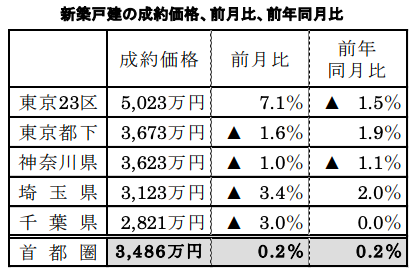新築戸建成約価格の平均は3486万円。前年同月から0.2%上昇し、9カ月連続のプラスとなった。前月比は、東京都下、神奈川県、埼玉県、千葉県の4エリアが下落したものの、価格水準の高い東京23区が5000万円以上の価格帯の割合上昇や平均敷地面積の拡大などにより7.1%上昇したことから、首都圏全体でもプラスとなった。