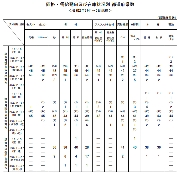 なお、同調査の対象となる土木工事での使用を想定した主要建設資材について、新型コロナウイルスによる影響と見られる動向変化は確認されなかった。