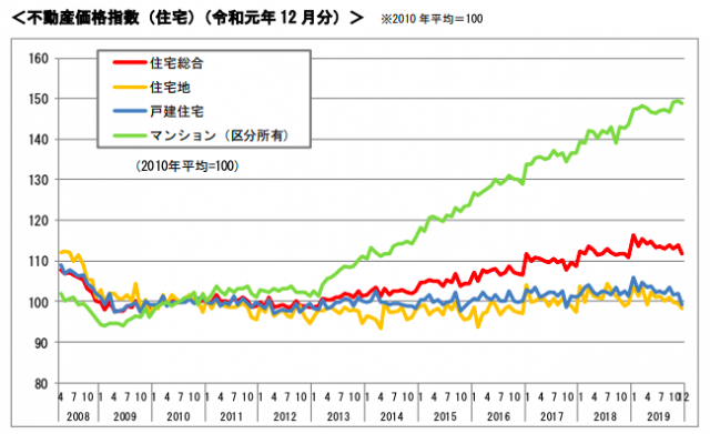国土交通省は3月25日、2019年12月分の不動産価格指数(2010年平均を100として算出)を公表した。住宅総合は前年同月比0.7%増の111.7となり、61カ月連続で前年同月比プラスとなった。住宅地は同1.2%減の98.3、戸建住宅は同2.1%減の99.1、マンション(区分所有)は同3.7%増の149.0だった。
