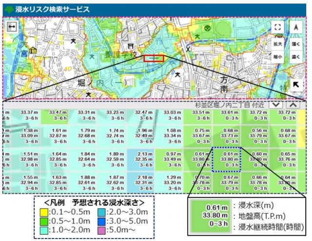 都では浸水区域図を2001年から作成し、これらの情報が区市町村の洪水ハザードマップに活用されている。近年の豪雨の多発から、検索サービスを開始した。避難計画だけでなく、まちづくりや住まい探しへの活用も想定される。