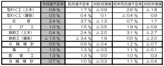 職種別の状況では、鉄筋工(建築)を除く全職種が不足となった。不足が最も大きかったのは左官(2.4%)だった。地域別では、東北、沖縄で均衡、北陸で過剰、その他の地域で不足となった。不足率の最大は九州(2.7%)、ついで中国(2.0%)、関東(1.1%)、北海道(0.8%)などとなった。