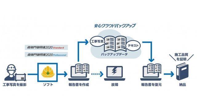 「安心クラウドバックアップ」は、「蔵衛門御用達2020」で作成した工事台帳や工事写真のデータをバックアップできる無料のクラウドストレージ。パソコンまたはハードディスクの故障や盗難によりデータが消失しても、復元して編集することができる。工事数に制限はなく、ひとつの工事につき2万枚の写真が保存可能。データはSSL /TLSを用いて暗号化している。
