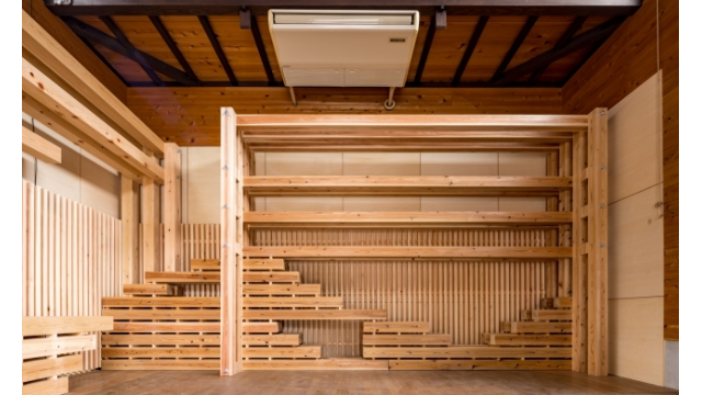 改修作業では、室内に入ってすぐの壁面に吉野スギの棚と吉野ヒノキのベンチを設置。様々な用途で使用できるようにと、中央部に空間を設けたデザインにした。全て新しくするのではなく、昔からある古い部分を残すことで、地域の文化や歴史、思い出を語り継げる場所として使用できるようにしたという。