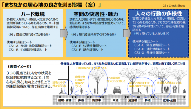 同指標は、昨年6月26日開催の「都市の多様性とイノベーションの創出に関する懇談会」からまとめられた『「居心地が良く歩きたくなるまちなか」からはじまる都市の再生』で提言された、「まちなかのアイレベル・グランドレベルにおける歩きやすさ、滞在しやすさなどを測る客観的指標の開発に着手すべき」との意見を受けて作成したもの。