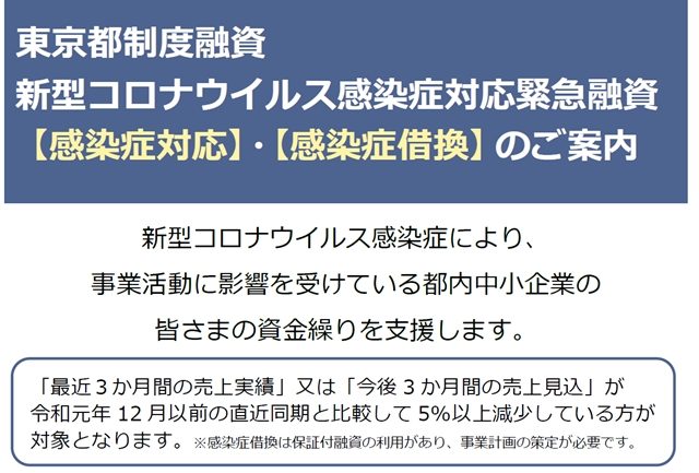 東京都と東京信用保証協会は、中小事業者向けに新型コロナウイルス感染症対応緊急融資として、新規の借り入れの「感染症対応」、借り換えの「感染症借換」のメニューを用意している。融資限度額は2億8000万円。融資期間は運転資金で10年。都が信用保証料の全額を補助する。