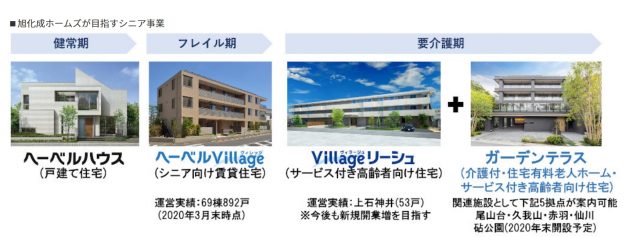 旭化成ホームズは主に東京都内でシニア向け賃貸住宅「へーベルヴィレッジ」69棟892戸を運営している。さらに要介護期に入居できるサ高住として「ヴィラージュリーシュ」シリーズを立ち上げて、2019年10月に東京都練馬区で53戸の第1弾物件「ヴィラージュリーシュ上石神井」を開設した。