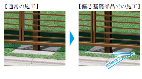 従来は、独立基礎の中心に支柱を建てるため、隣地との境界線からセットバックしてフェンスを設置する必要があったが、新たに基礎端部から最小85mm偏芯して支柱を建てられる独自基礎部材を設定した。
