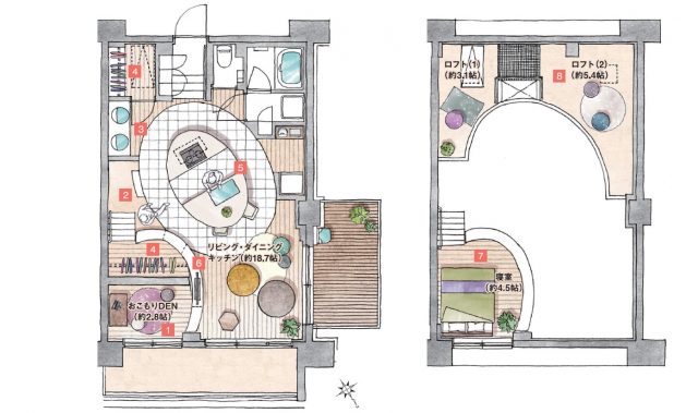 こちらは、休日や就寝時間など生活リズムが異なる共働き夫婦を想定。あえて夫婦別寝室とし、各自専用の洗面台、収納、下足入れ、ロフト等を設置することでケンカの種をなくし、2人でゆったり過ごせるようにLDKにリビングベッドを設けた。