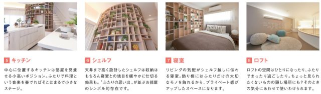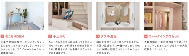 家事は協力しつつ1人時間も大切にしたいという共働き夫婦を想定し、相手が見え隠れするオープンシェルフで囲まれた寝室や小上がりなど、お互いの存在をさりげなく感じられる工夫を盛り込んだ。さらに、並んで身支度ができる2つの洗面化粧台、一段高い場所でふたりで調理ができるステージキッチン、仕事や勉強、ケンカ後のクールダウンに使える1人空間「おこもりDEN」などを設けた。