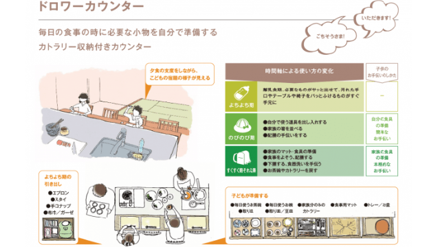 同社は、多様化する生活スタイルやニーズに応えるため、2018年度から同プロジェクトを展開。このほど開発した「famiカジ」は、共働き子育てファミリーに向けた「家族みんなが楽しく家事をしたくなる住まい」をコンセプトとする新しい住空間。「帰宅後に持ち物の整理ができるウォークスルー収納」や「食事の時に必要な小物を自分で準備するカトラリー収納付きカウンター」など、効率的な家事スタイルを叶えるヒントが盛り込まれている。