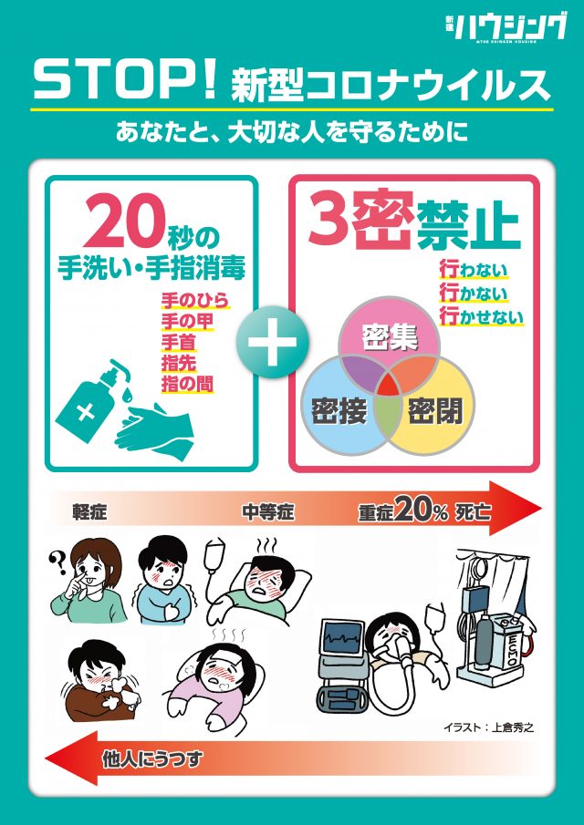 社内やモデルハウス、家庭にも貼っておける感染予防の啓発ポスターです。手洗いの徹底はよく言われていることですが、WHOでは、手指消毒も20秒間かけてしっかり行うことが重要としています。