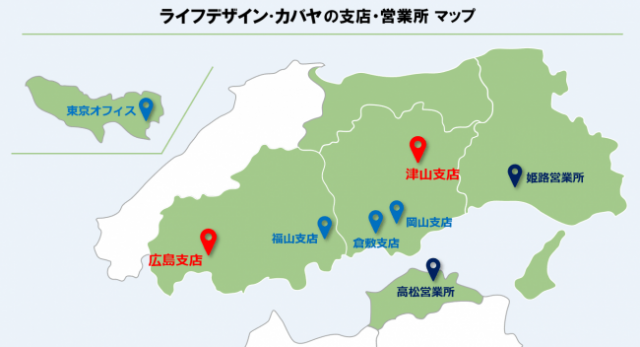 ライフデザイン・カバヤ(岡山市)はこのほど、広島支店と津山支店を開設した。2017年に開設した岡山支店、倉敷支店、福山支店と合わせ、5支店となった。