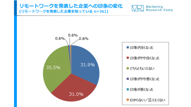 ジャストシステム(東京都新宿区)が運営するマーケティングリサーチに関する情報サイト「Marketing Research Camp」はこのほど、「リモートワークに関する実態調査」を実施し、その結果を発表した。直近3カ月の間に、緊急時対応としてリモートワークを導入、または推奨を発表した企業を「知っている」と答えた人は43.7%。そのうち62.9%の人が、導入企業に対する「印象が良くなった」と答えた。
