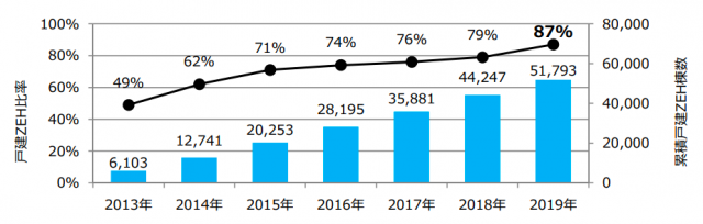 積⽔ハウス(大阪市北区)は4月10日、同社の2019年度の新築⼾建て住宅におけるZEH(ネット・ゼロ・エネルギー・ハウス)の⽐率が87%となり、2020年度⽬標の80%を前倒しで達成したと発表した。2013年から供給を開始したZEH「グリーンファースト ゼロ」は、今年3⽉末現在で累積普及棟数5万1793棟となった。