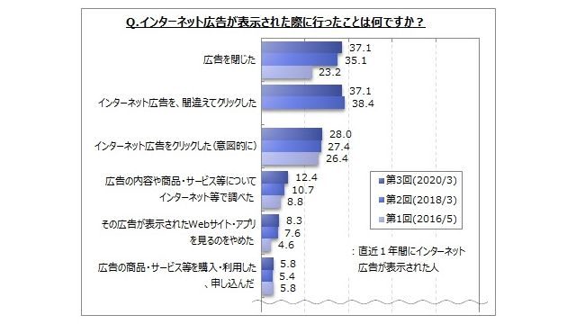 マイボイスコム(東京都千代田区)はこのほど、3回目となる「インターネット広告」 に関する調査を実施し、その結果を発表した。直近1年間にインターネット広告が表示された人に、広告が表示された際に行ったことを聞いたところ、「広告を閉じた」、「広告を間違えてクリックした」が各37.1%、「広告をクリックした(意図的に)」が28.0%だった。「間違えてクリックした」は、女性10~30代で5割前後と他の層より高くなった。
