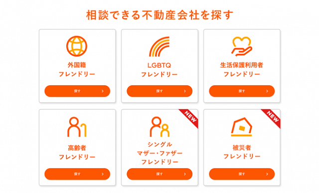 LIFULL(東京都千代田区)が運営する不動産・住宅情報サイト「LIFULL HOME’S」は4月14日、さまざまなバックグラウンドを持つ人たちに理解があり相談に応じてくれる不動産会社を検索できる「FRIENDLY DOOR」にて、新たなカテゴリー「シングルマザー・ファザー」「被災者」を追加したと発表した。
