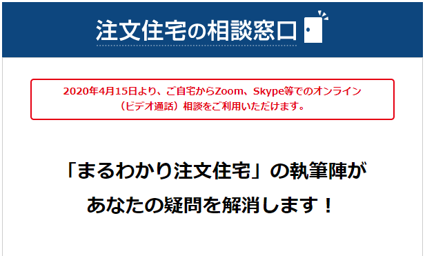 自宅からZoom、Skype等でオンライン(ビデオ通話)相談が無料で利用できる。相談内容に応じて、「注文住宅ご相談窓口」「住宅会社ご紹介サービス」「建築家ご紹介サービス」の各サイトから予約することで相談が受けられる。
