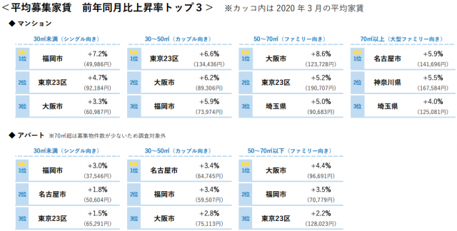 面積帯別の平均募集家賃の前年同月比上昇率トップエリアは、マンションの30m2未満(シングル向き)が福岡市(+7.2%、3月平均家賃=4万9986円)、30~50m2(カップル向き)が東京23区(+6.6%、同=13万4436円)、50~70 m2(ファミリー向き)が大阪市(+8.6%、同=12万3728円)、70 m2以上(大型ファミリー向き)が名古屋市(+5.9%、同=14万1696円)。
