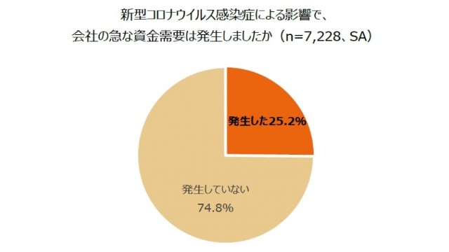 エヌエヌ生命保険(東京都千代田区)はこのほど、「新型コロナウイルスによる中小企業の資金需要に関する調査」を実施し、その結果を発表した。新型コロナウイルス感染症による影響で会社の急な資金需要が「発生した」割合は25.2%。具体的な資金繰り策としては、「公的機関からの融資」(19.2%)が最も多く、「銀行からの融資」(15.0%)、「親族からの借入」(14.0%)と続いた。