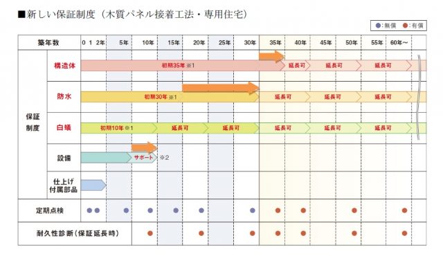 ※1:点検制度による点検(無償)と耐久性診断(有償)の実施、診断結果に基づく耐久性維持のために必要と判断された有償工事(耐久工事)による継続的な保証延長の実施が条件※2:ミサワホームオーナー専用サイトより設備サポートプラン(有償)に加入で、特定設備(キッチン、ユニットバス、エアコン、洗面化粧台、トイレ、インターホン、給湯器等)について初期保証期間満了後の作動不良を5年間サポート(無償)