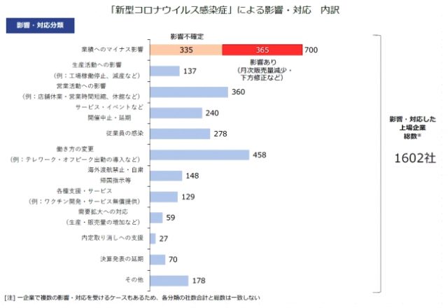 昨年12月~4月17日時点までに、工場や店舗などの休業、防疫措置など、何らかの影響を受けた上場企業の数は1602社。前回調査時から560社の増加となり、全上場企業(3778社)の4割超に影響が及んでいることが明らかになった。