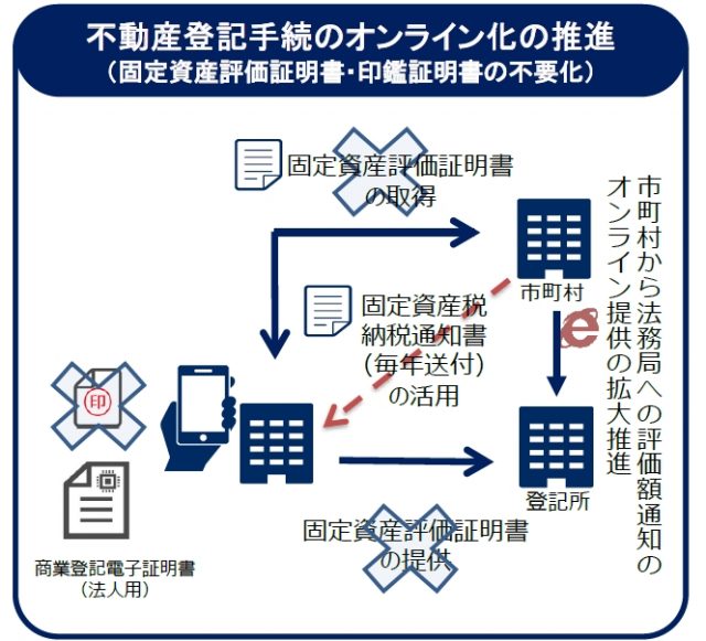 不動産登記では登記事項証明書の添付省略に加え、3月30日から法人の印鑑証明書の添付を不要とする制度改正を行っている。今後、固定資産評価証明書の不要化を検討する。固定資産評価証明書は登記時の登録免許税の納税額を計算するために使用しているが、固定資産納税通知書からも計算が可能なため、納税通知書の活用の方策を今年度中に実施する。1月から始まっている、市町村から法務局への固定資産評価額のオンライン提供の拡大を推進する。オンライン手続の前提である商業登記電子証明書の普及促進などにも努めていく。