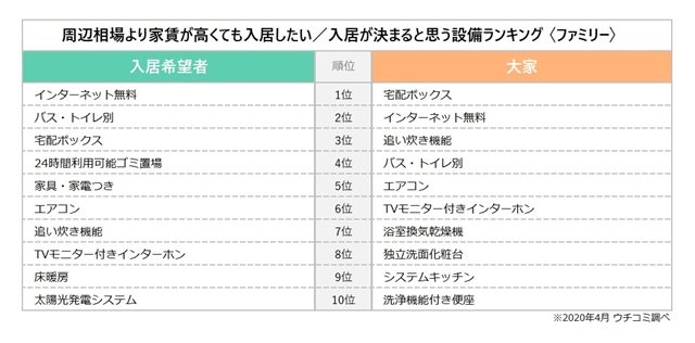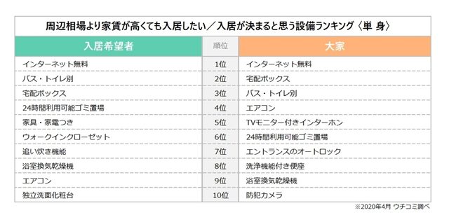 ウチコミ(東京都新宿区)はこのほど、同社が運営する賃貸情報サイト「ウチコミ!」に登録する大家・入居希望者を対象に、居住用賃貸物件の設備についてのアンケート調査を実施し、その結果を発表した。入居希望者に対し、周辺相場より家賃が高くても入居したいと思う設備を尋ねたところ、1位は「インターネット無料」だった。2位の「バス・トイレ別」、3位の「宅配ボックス」に差をつけて、単身者・ファミリー層の両者から圧倒的な人気を獲得した。