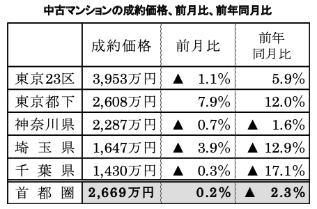 中古マンション成約価格の平均は2669万円となり、前月比で0.2%上昇。前年同月比は2.3%下落し、2カ月連続のマイナスとなった。エリア別では、前月がプラスとなっていた埼玉県と千葉県の前月比が反転下落となった一方、東京都下では4000万円以上の価格帯の割合が高まったことなどにより前月比7.9%の上昇となった。