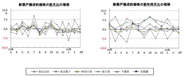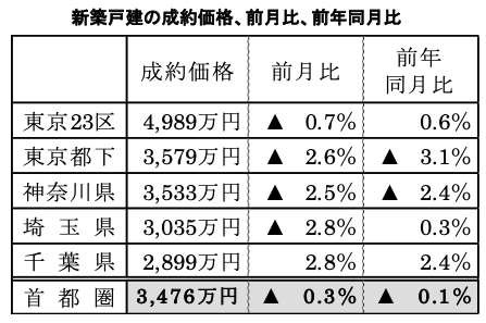 不動産情報サービスのアットホーム(東京都大田区)は4月21日、同社の不動産情報ネットワークに登録されて成約した首都圏(1都3県)の新築戸建・中古マンションの3月期成約価格を発表した。新築戸建成約価格の平均は3476万円となり、前月比で0.3%下落。前年同月比では0.1%下落し、10カ月ぶりにマイナスとなった。