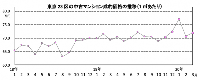 東京23区の成約価格の前月比は、1戸あたりでは1.1%の下落となるも、1m²あたりでは1.9%上昇。1m²あたりの成約価格は5カ月連続で70万円を超えた。