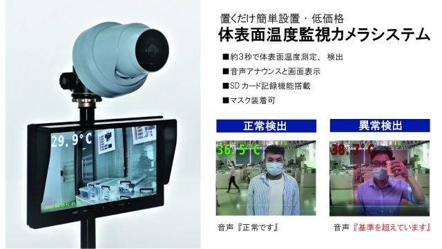 体表面温度監視カメラ、モニタ付きレコーダー、取付台のセット。 体温を自動検知し、設定温度を超えると音声と画面で通知する。誤差は±0.3度。別売のSDカードにより映像を記録することもできる。