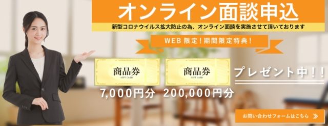 面談希望の顧客に対して、電話とPC・スマートフォン・タブレットなどの端末により、画面越しに同社営業担当者の顔が見える状態で面談を開始する。オンライン面談のメリットとしては、「顧客の利便性」「営業の働き方改善」「コスト削減」などがあげられる。なお、今面談すれば7000円分の商品券をプレゼントしている。