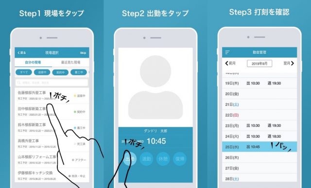 職方が入退場する際に、スマホを使って「現場名」「出勤」をタップするだけで、現場における「だれが・どこで・いつからいつまで」の入退場情報を記録できるシステム。
