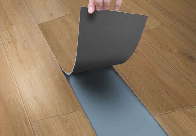 裏面にノンスリップ加工がほどこしてあるため、接着剤が不要。壁際の床材のみ両面テープで固定し、あとは置くだけで施工が完了する。PVC素材のため、カッターで簡単に切断できる。