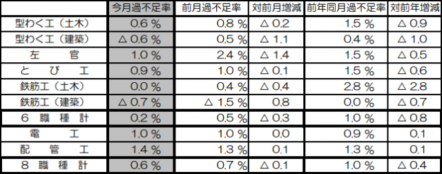 職種別の状況では、型わく工(建築)、鉄筋工(建築)以外の職種で不足となった。不足が最も大きかったのは配管工(1.4%)だった。地域別では、東北で均衡、北陸と中国で過剰、その他の地域で不足となった。不足率の最大は九州(1.1%)、ついで関東(0.9%)、北海道(0.7%)、四国(0.6%)などとなった。