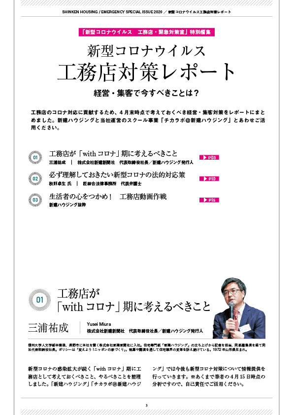 「withコロナ期」に工務店がやるべきことを解説した「新型コロナウイルス 工務店対策レポート」を「工務店緊急対策室」にて無料配布をスタート! 現状把握・この先の見通しから法律関連、集客方法や商談ツールなどいま工務店に必要な情報を分かりやすく解説しています。