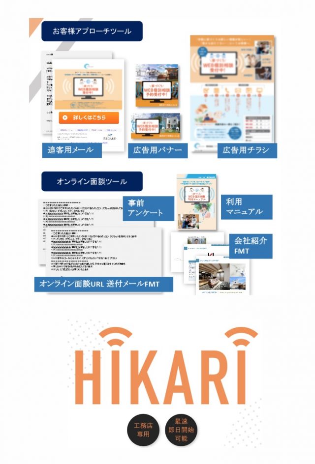 工務店マーケティング支援のSHO-SAN(東京都国分寺市)は、新型コロナウィルス感染拡大の影響で集客・面談数が減少している工務店向けに、即日オンライン商談が開始できるというツールパッケージ「HIKARI」の提供を始めた。