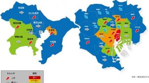 「2019年第4四半期1都3県賃貸住宅市況図」では、上昇トレンドを示す地域が前年同期比2地域増の12地域、下降を示す地域が同4地域増の14地域となった。金融機関の貸出態度硬化により新規供給量が減少傾向にあることから、アパート系が多く供給されている東京23区の外側の区で市場好転の兆しが見られたほか、千葉県では台風被害に対する賃貸型応急住宅供与の影響で市場が一気に好転した。