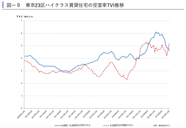 「東京23区ハイクラス賃貸住宅の市場動向」では、5000円/m2月超クラスの空室率TVI(タス空室インデックス)が2019年以降、おおむね横ばい傾向。供給量の多い4000~5000円/m2月クラスは、金融機関の貸出態度硬化の影響で新規供給が減少したことから改善傾向で推移した。2019年末時点の募集期間は、5000円/m2月超クラスで2.27カ月、4000~5000円/m2月クラスで2.68カ月。賃料指数は、5000円/m2月超クラス、4000~5000円/m2月クラスともに振れ幅が大きいものの減少傾向となった。