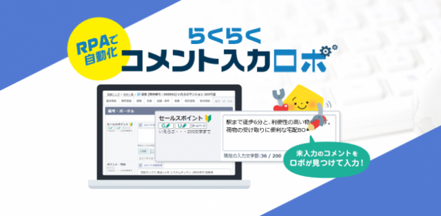 いえらぶGROUP(東京都新宿区)は4月28日、RPAを使った新サービス「らくらくコメント入力ロボ」をリリースした。ロボットがシステムに登録された物件に対して自動でコメントを入力し、不動産業務を効率化する。
