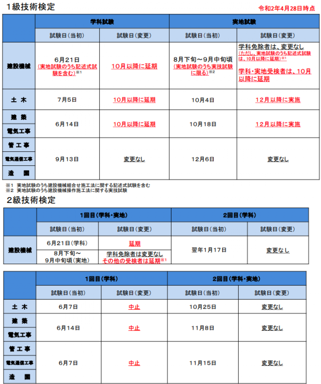 1級技術検定のうち、土木、建築、電気工事の学科は10月以降、実地は12月以降に延期。建設機械の学科は10月以降に延期、実地は学科免除者が8月下旬〜9月中旬頃で変更なし(記述式試験は10月以降に延期)、学科・実地受験者が10月以降に延期となる。管工事、電気通信工事、造園は、学科・実地とも変更なし。