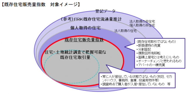 同指数は、建物の売買を原因とした所有権移転登記個数(登記データ)のうち、個人取得の住宅で既存住宅取引ではないものを除き、2010年平均を100として指数化したもの。総務省統計局の「住宅・土地統計調査」で把握可能な「既存住宅取引量」には含まれていない別荘、セカンドハウス、投資用物件等を含む。また、マンションにおいて床面積30m2未満の数値を含んだものと除去したものとを併用して公表する。